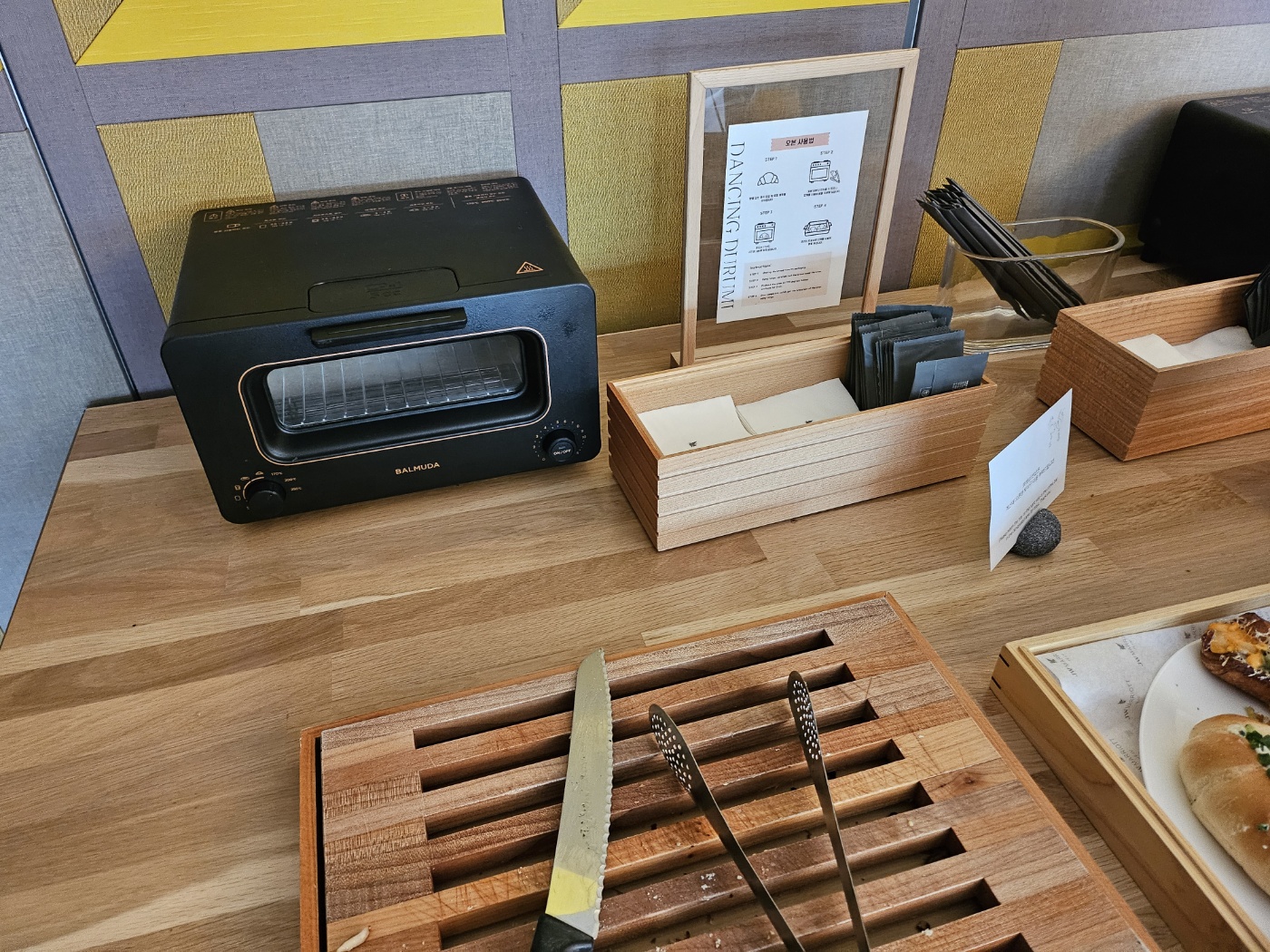 테이블 홀로 가는 길에 셀프 데스크가 있었는데 이곳에서 빨대나 티슈를 가져올 수 있고, 오븐이 있어서 빵을 데우거나, 칼로 빵을 자를 수 있는 공간이 있었습니다.